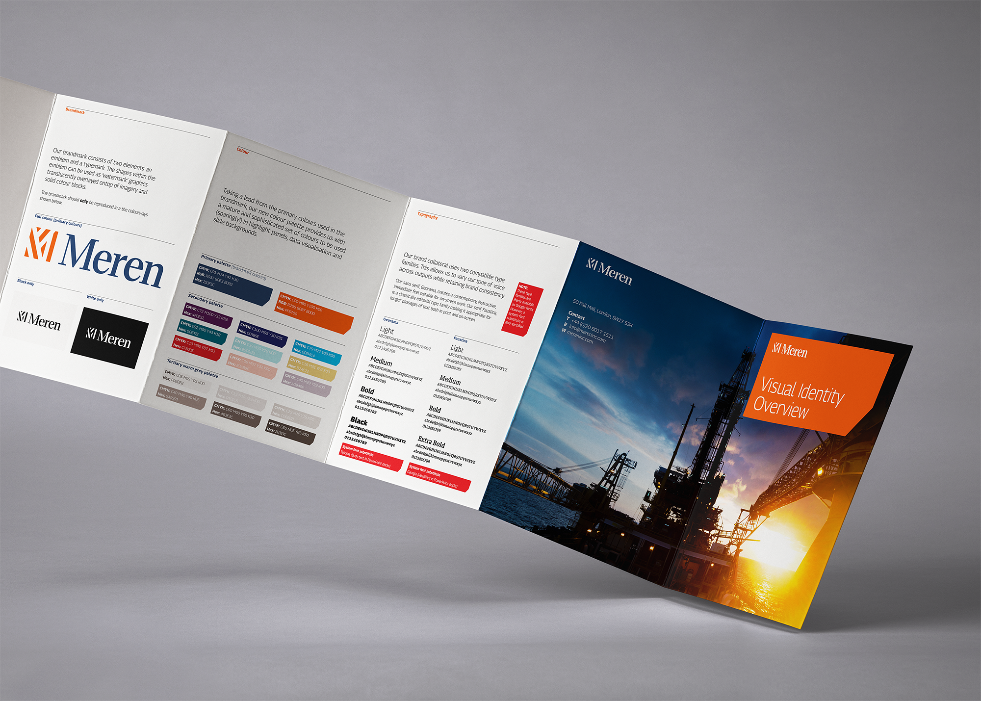 The Meren logo, visual assets, and brand guidelines were developed in close collaboration with the client, ensuring their vision was central to every stage. The client’s specific request for the brandmark was a design featuring both an emblem and a type mark. The resulting emblem is an abstract derivation of an upper-case M, while the type mark uses a contemporary serif suggesting a confident and reassuring maturity. This combination effectively balances modern efficiency with the refined outlook that defines the new business.